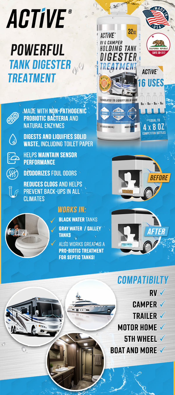 Works with All Holding Tanks: Suitable for all Black and Grey Water Tanks in RV, Camper, Marine, Porta Potty, Cassette Toliet or other unique camp waste solutions. Compatible with Thetford Camco Airstream Winnebago Jayco Starcraft and more